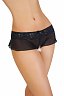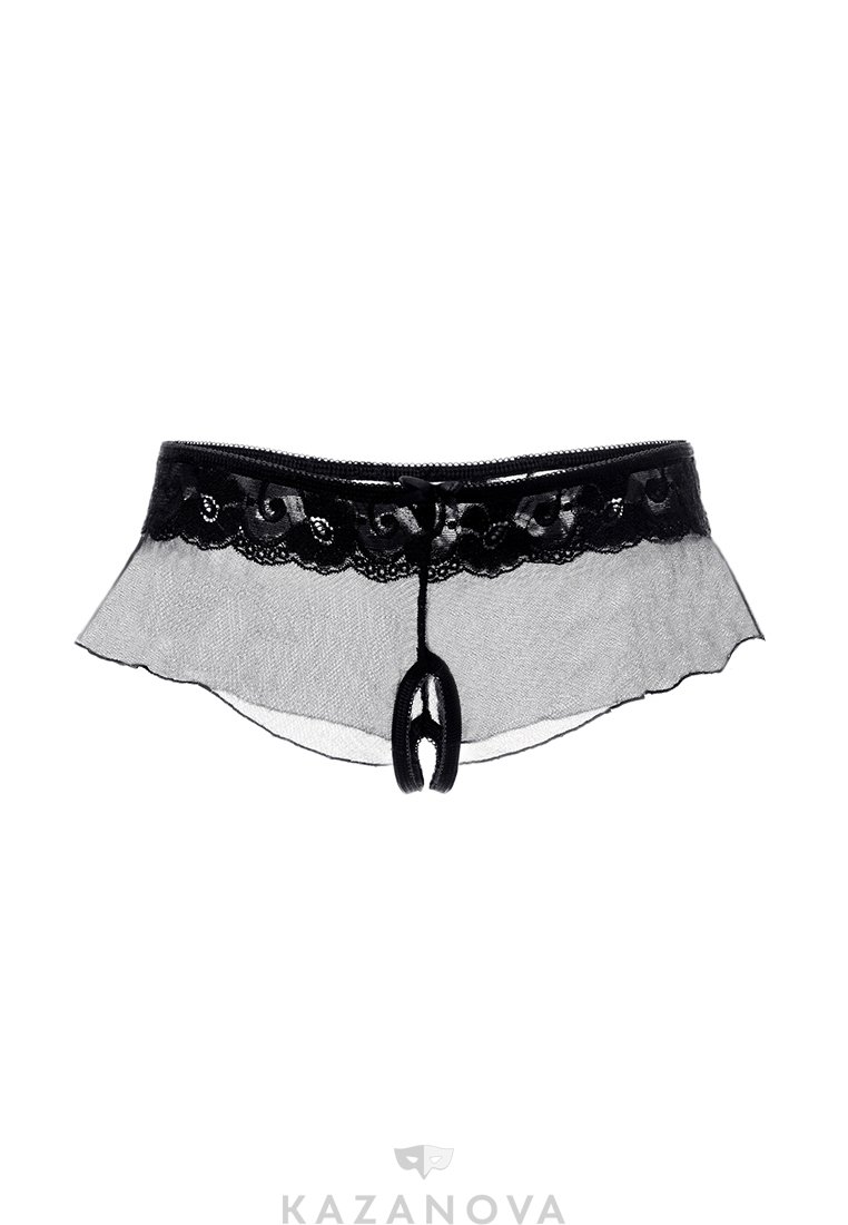 Трусики изготовлены из эластичной ткани черного цвета и плотно облегают тело. Имеют доступ к интимной зоне.