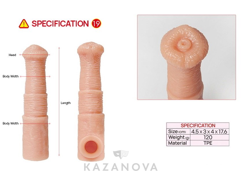 Насадка сделана из эластомера и плотно обхватывает половой член, не соскальзывает во время фрикций.