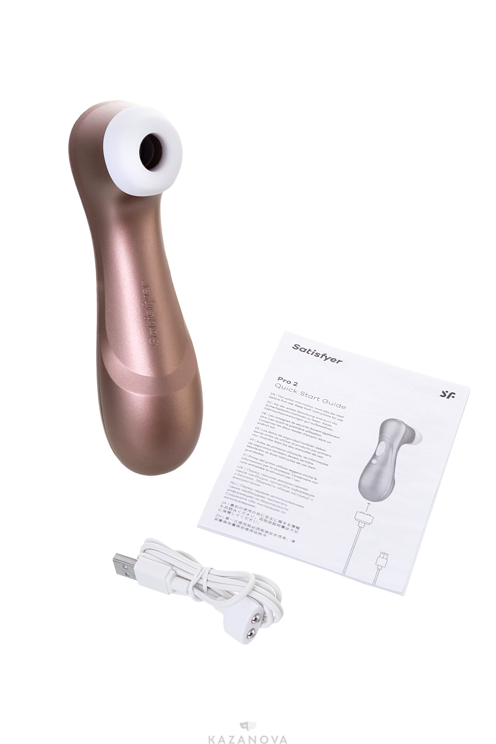 Satisfyer PRO2 Next Generation перезаряжается от любого USB-порта. Зарядка и сменная головка входят в комплект.