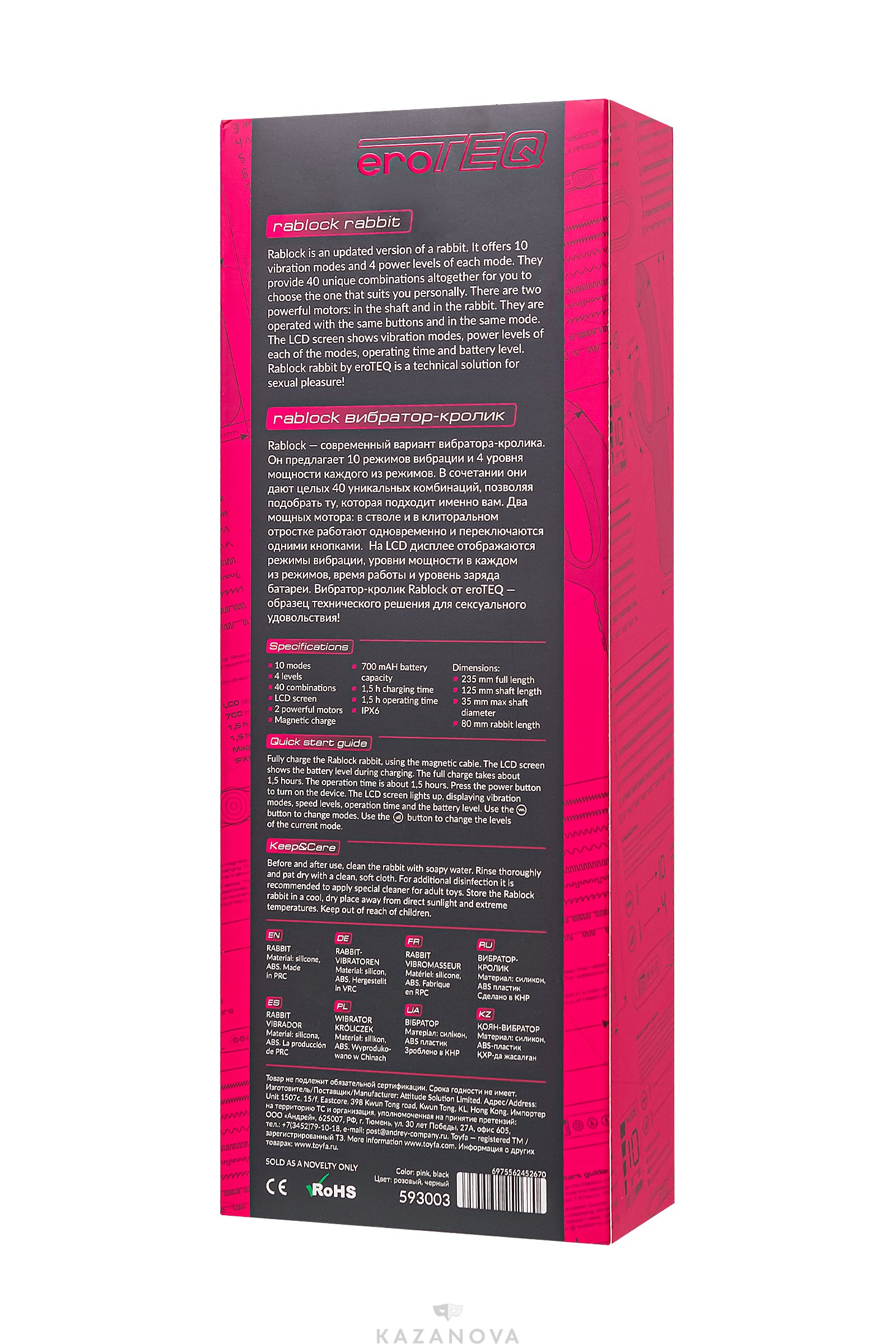 Революционная концепция Toyfa eroTeq Rablock начинается с LCD экрана, который предоставляет полный контроль над всеми функциями – 10 режимами вибрации, 4 уровнями интенсивности, временем работы и уровнем заряда батареи. Управление вибратором – легко и интуитивно понятно, благодаря лишь одной кнопке, удобно расположенной в рукоятке. Ничто не отвлечет тебя от наслаждения в этом лабиринте сексуальных удовольствий.