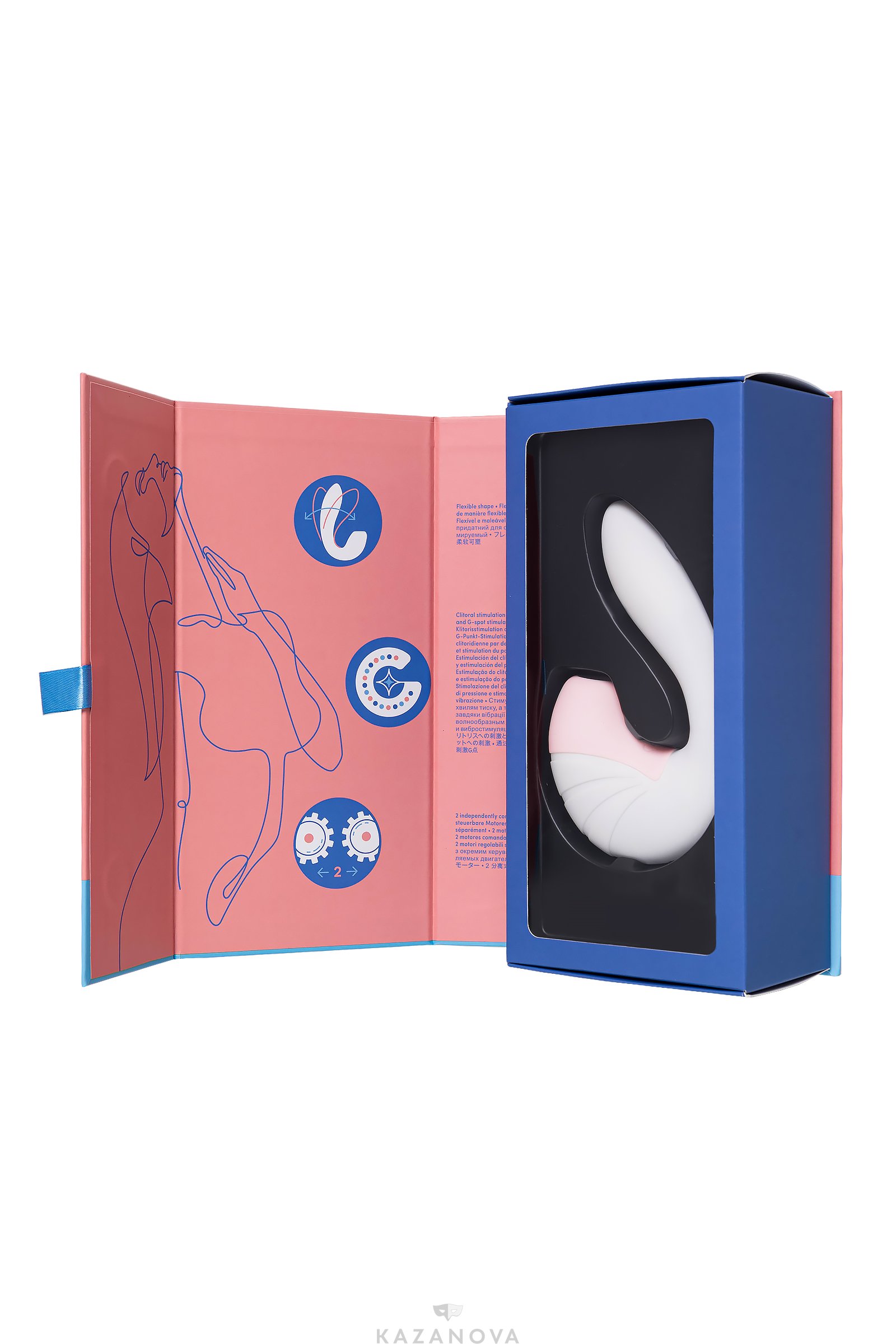 Увеличенная погружная часть с изогнутым окончанием предназначена для воздействия на зону G, а внешняя – для бесконтактной стимуляции клитора с помощью вакуумно-волновых потоков.
