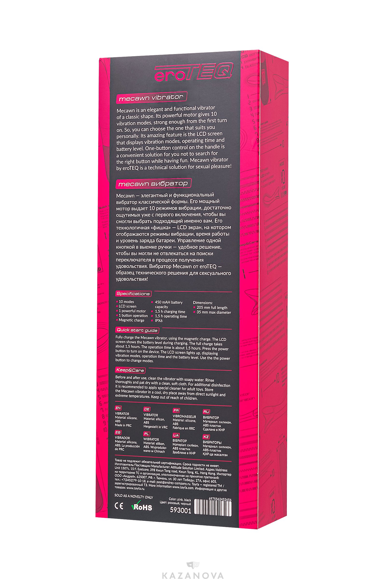 Революционная концепция Mecawn начинается с LCD экрана, который предоставляет полный контроль над всеми функциями – 10 режимами вибрации, временем работы и уровнем заряда батареи. Управление вибратором – легко и интуитивно понятно, благодаря всего лишь одной кнопке, удобно расположенной в рукоятке. Ничто не отвлечет тебя от наслаждения в этом лабиринте сексуальных удовольствий.