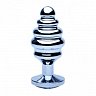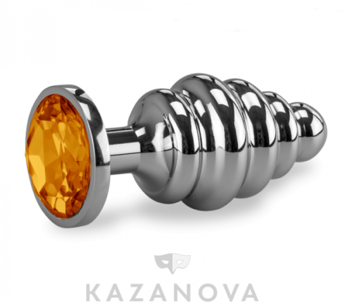 Втулка анальная металлическая большая ребристая серебристая с янтарным стразом 9,3 см