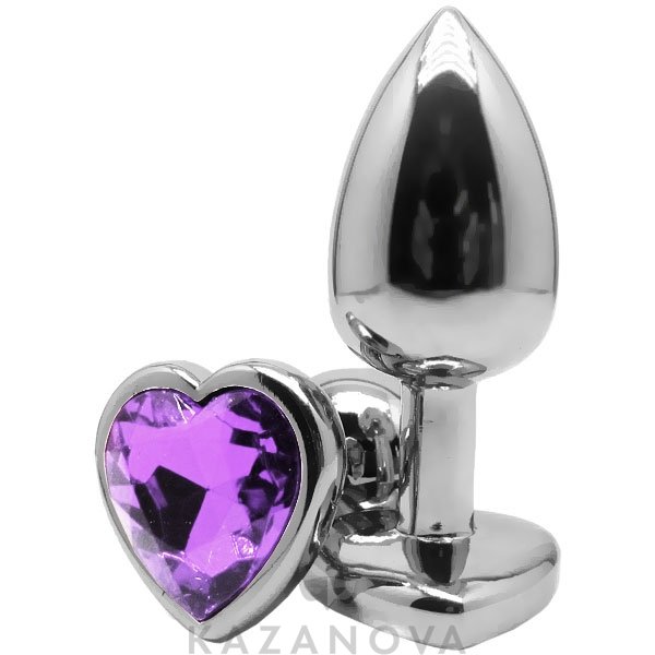 Втулка анальная металлическая большая серебристая в форме сердечка с сиреневым камнем