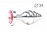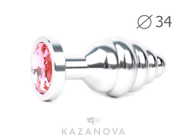 Втулка анальная металлическая средняя ребристая серебристая c розовым кристаллом