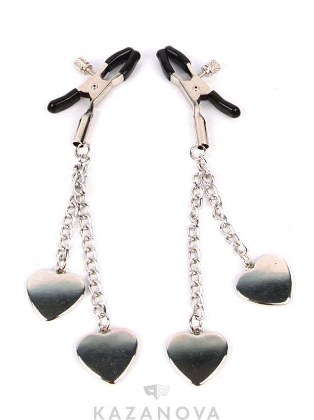 Силиконовые накладки снижают степень давления и помогают снизить риск повреждения сосков. Зажимы декорированы металлическими сердечками на цепочках.