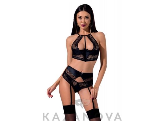 В комплекте: бюстгальтер, пояс для чулок, стринги.